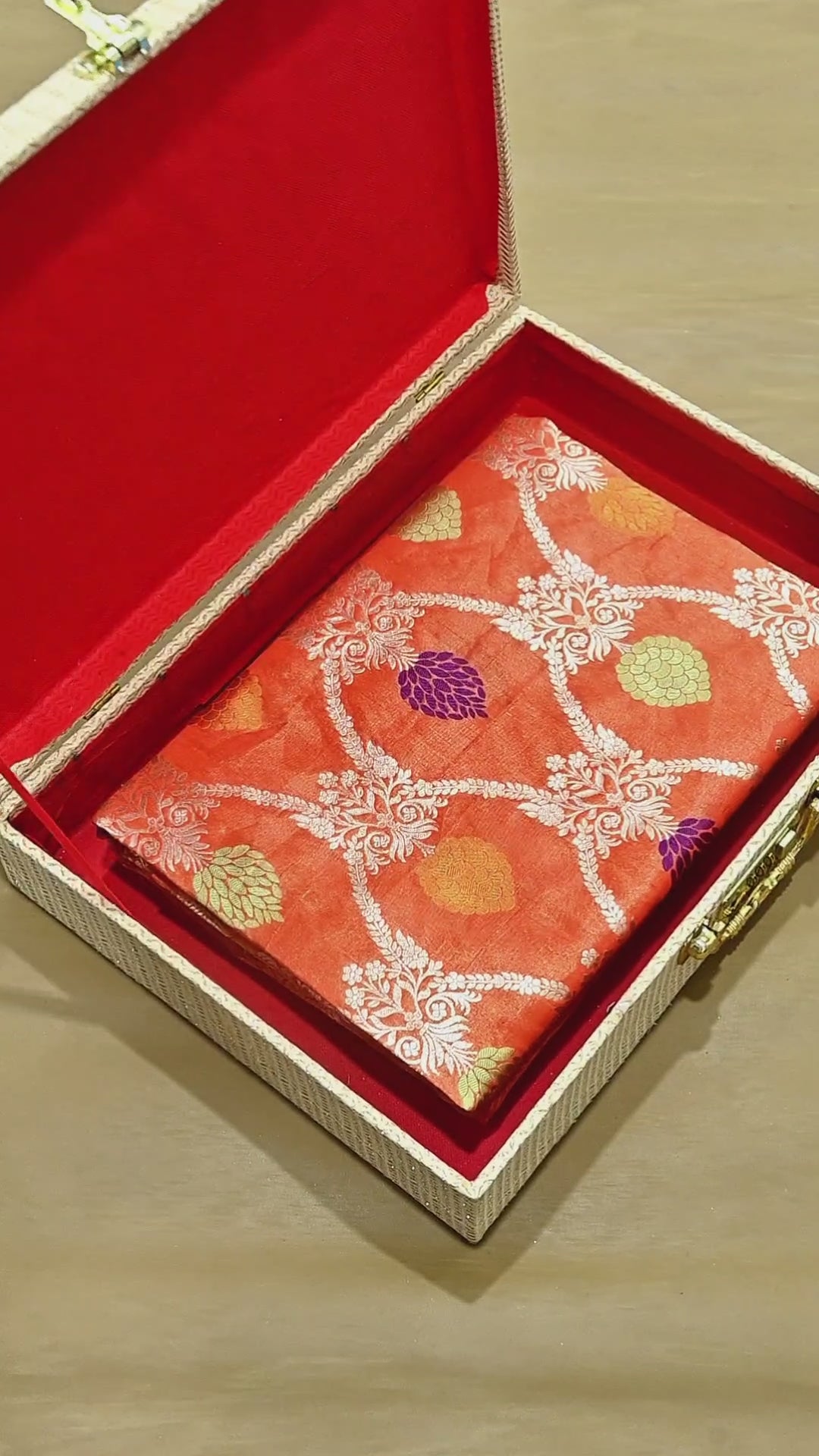 Indulge in luxury with our Banarasi Handwoven Katan Silk Saree. Its intricate Kadhua Meenakaari weaving creates a mesmerizing pattern, while the Silkmark Certification ensures the highest quality. Elevate your wardrobe with this exclusive piece in striking orange.
