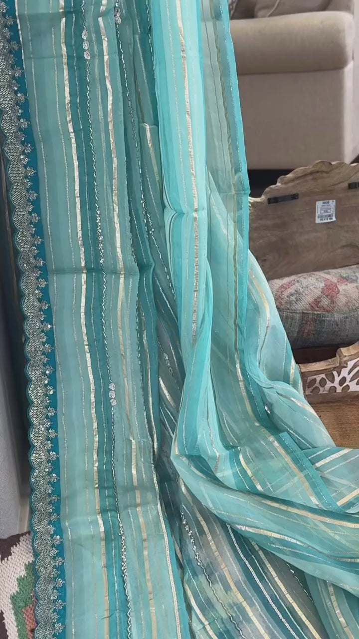 Indulge in luxury with our stunning Organza Saree. This exquisite piece features delicate stripes, shimmering sequins, and intricate gota lace, all in a beautiful blue hue. Add a touch of sophistication and elegance to your wardrobe with this one-of-a-kind saree.